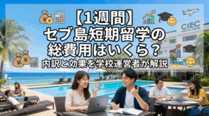 セブ島留学1週間の総費用は約23万円。コース料金・SSP・航空券・保険まで内訳を全公開。隠れコストや他校比較、1週間で得られる効果も学校運営者が正直に解説します。