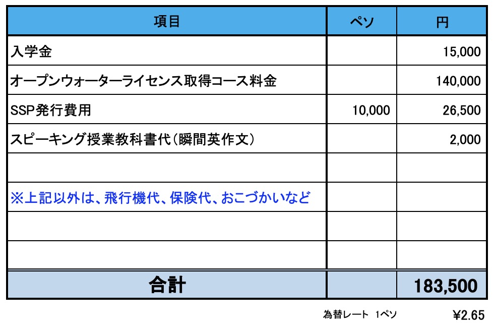 - 両ライセンス取得費(オープンウォーター、アドバンスド)