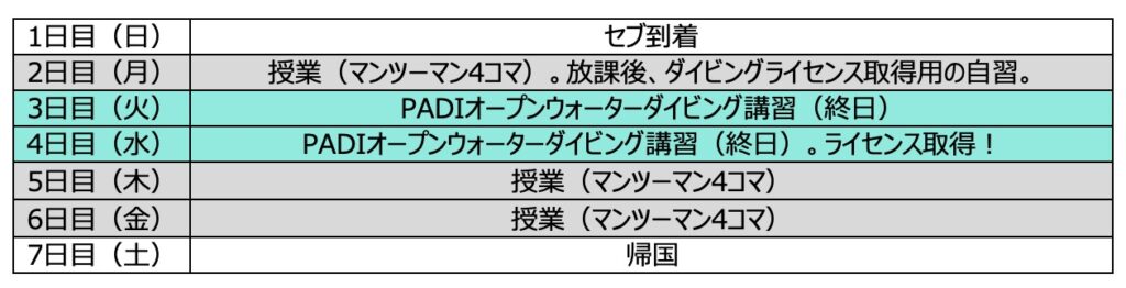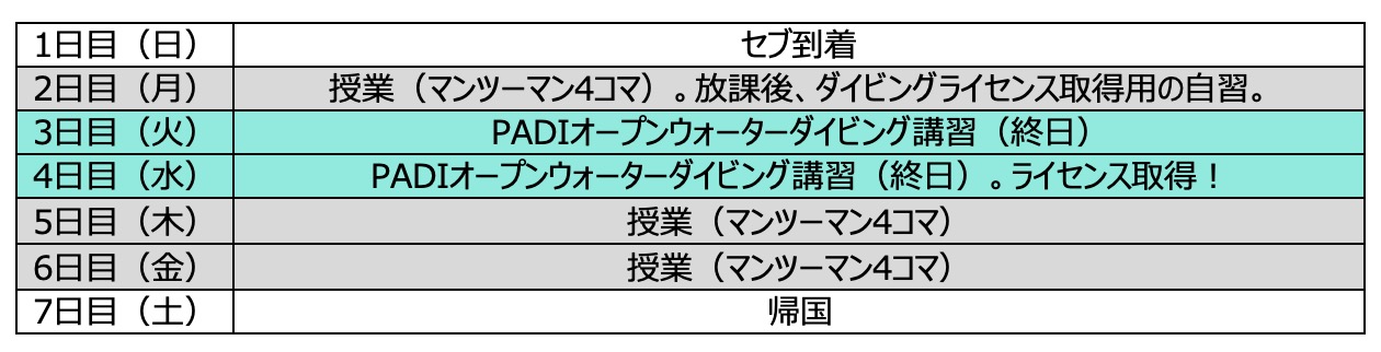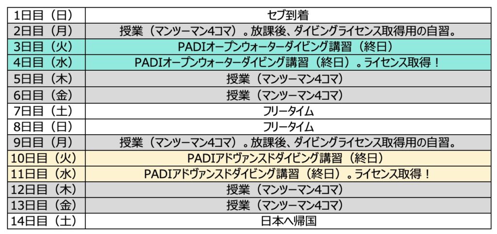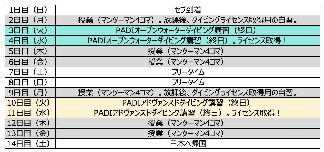 下記がダイビング留学2週間のスケジュールです。