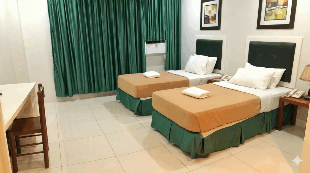 『エースペンション/Ace Penzionne』という、ホテル予約サイトでも評価の高いホテルを、教室&宿泊施設として使用しております。日本人観光客も多く宿泊しており、日本人リピーターも多いホテルです。また、出入口には24時間受付係が常駐しており、全フロアに監視カメラも設置されていますのでセキュリティ面でも安心です。このホテル内には、1階に日本食レストラン『Oishi Cebu / おいしいセブ』、2階には評判の良い格安マッサージ店『ヌアタイ』があり、安心してお過ごし頂ける環境です。