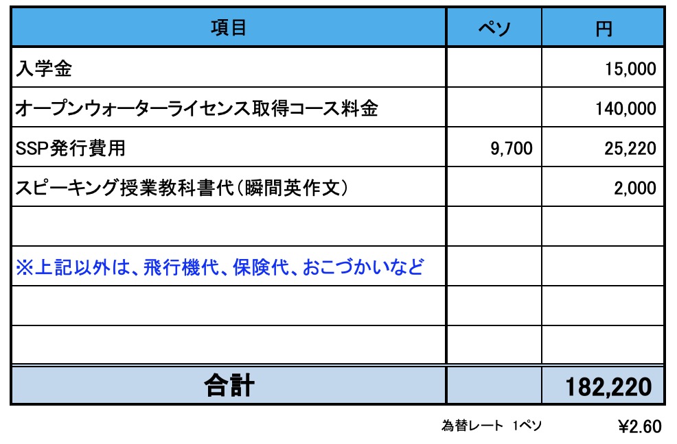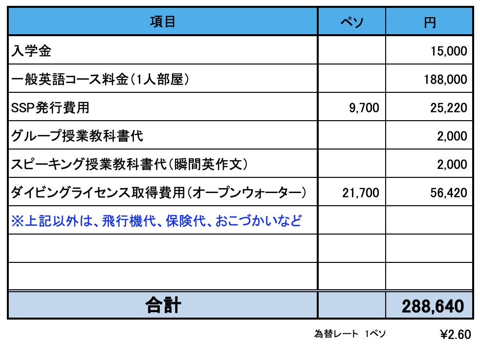 上記の費用に、飛行機代(5万円〜8万円)、おこづかいを入れると総額25万円ぐらいで、1週間の英語留学とオープンウォーターランセンスを取得することができます。
