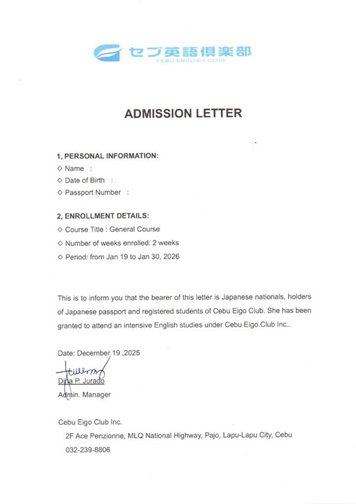 『セブ英語倶楽部でこの期間は留学予定です』