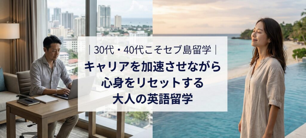 この記事では、30代・40代の社会人がセブ島留学を選ぶべき理由を『キャリアへの投資』『心身のリセット』『大人のための快適な学習環境』の3つの観点で徹底解説します。
